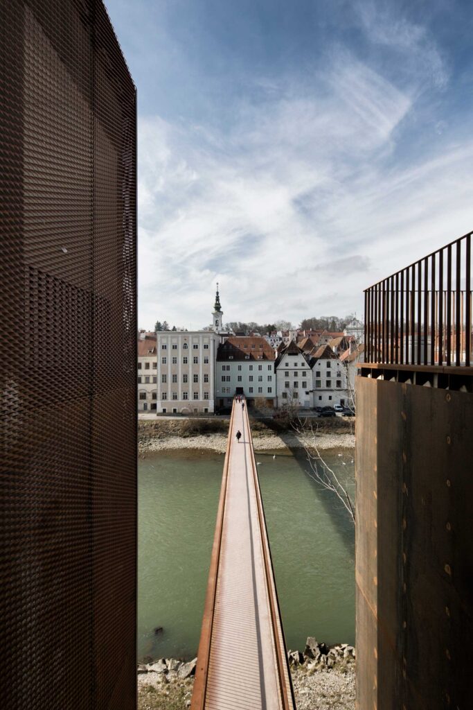 Preisgekrönte Fußgängerverbindung aus wetterfestem Stahl in die denkmalgeschützte Altstadt.