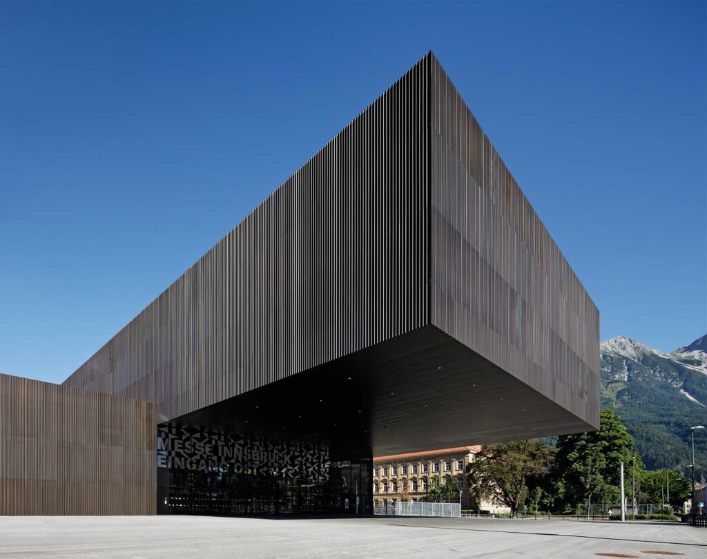 Eine markante Auskragung mit 25 m empfängt die Besucher der neuen Messe Innsbruck.