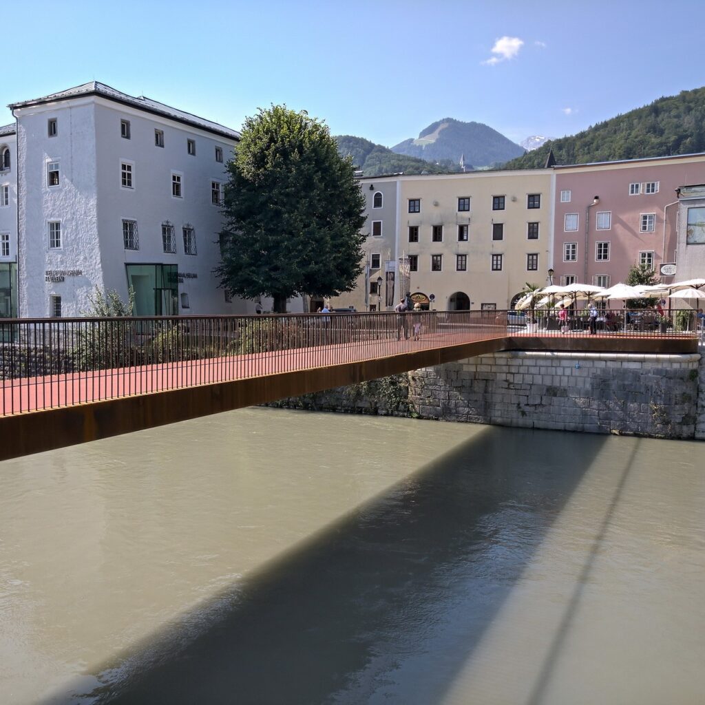 Schmal, aber sehr stark frequentiert: der Pfannhausersteg ist eine wichtige Verbindung ins Herz der Halleiner Altstadt.