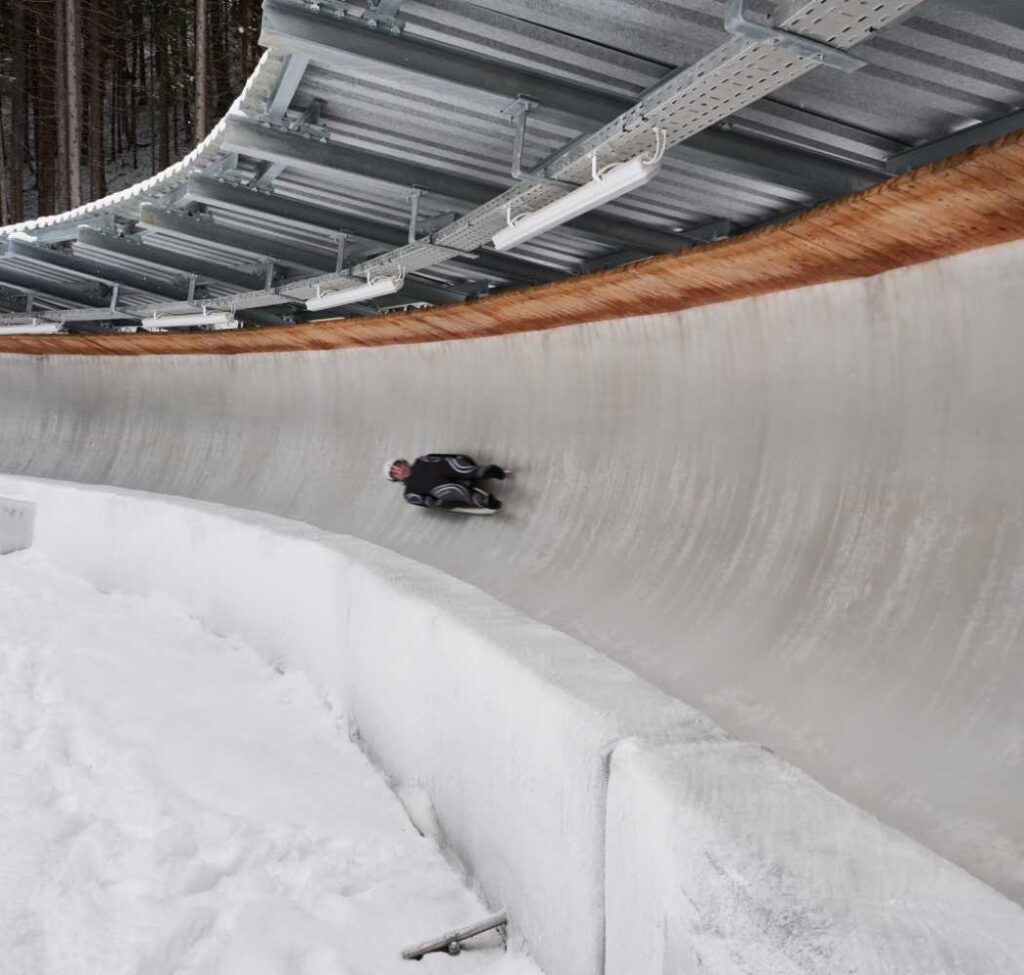 Die gesamte Eisbahn ist mit einem Stahldach versehen, zum Schutz vor der direkten Sonneneinstrahlung.